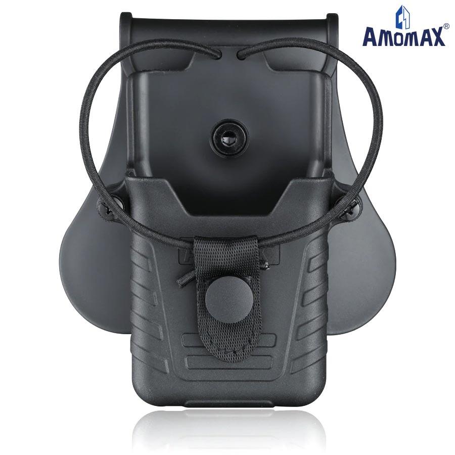 Amomax radio holder goes with different options of carrying attachments, including paddle (standard), belt clip, MOLLE, and drop leg platform.