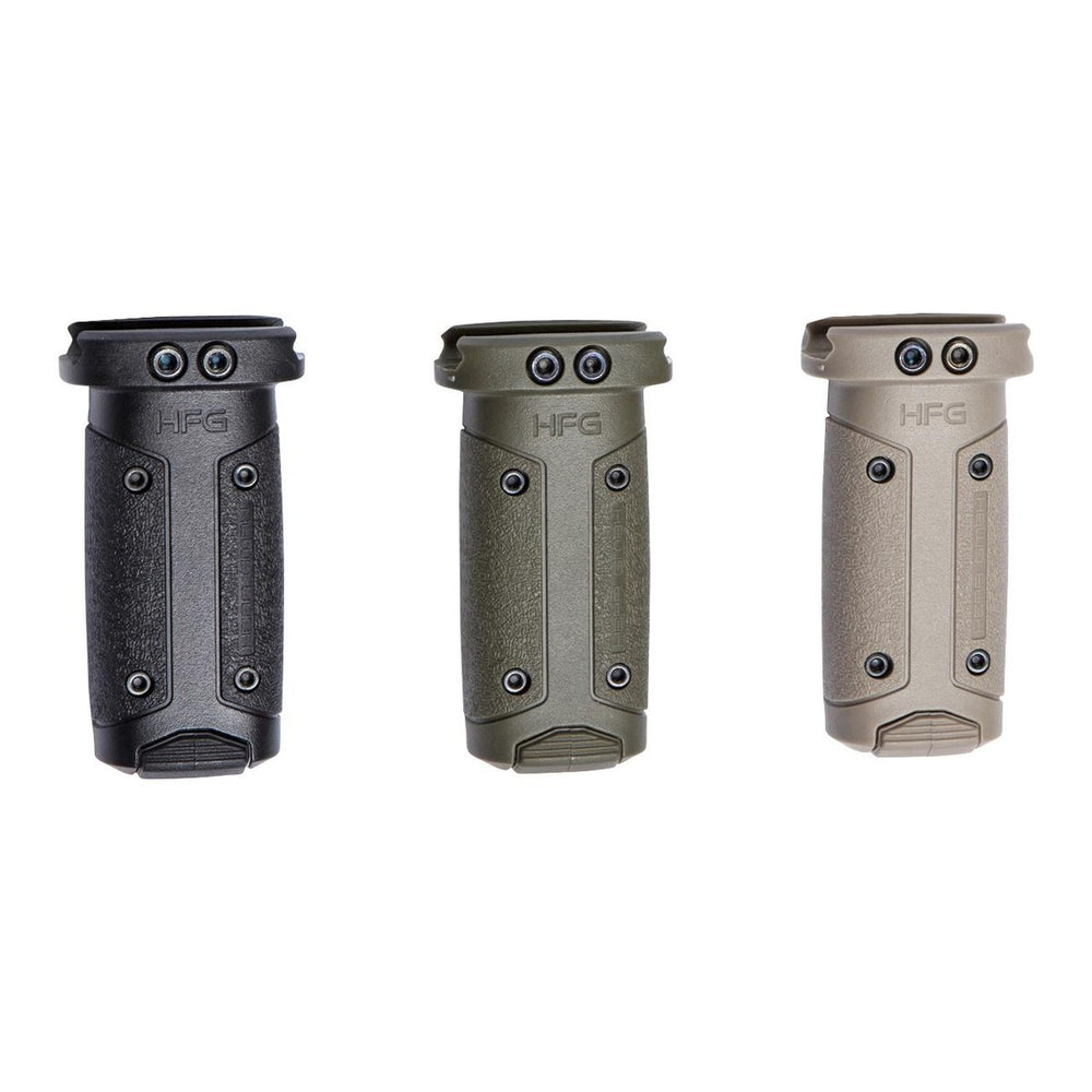 HERA Front grip (HFG) is an easy to install vertical front grip made out of fiberglass reinforced polymer. It is short and compact with a slim snag free profile. The exterior has a modern design with textured grip surfaces. There is an internal storage compartment that can be used to store a small tool kit.