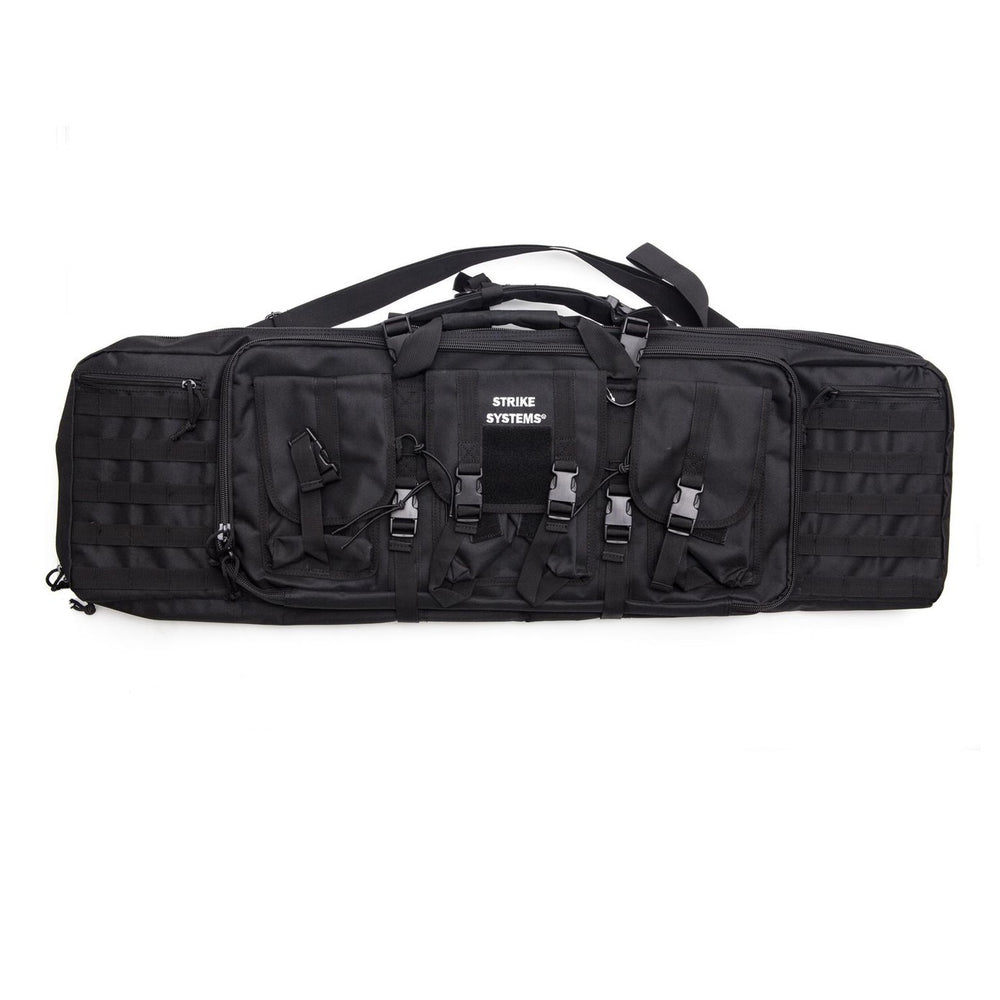 Protect your Airsoft gun in transport and storage, with a STRIKE SYSTEMS® padded weapon case with 11 pockets.The main compartment easily holds two carbines separated by a padded divider. The large pocket contains two light padded handgun pockets and two internal zipper pockets but can also hold a SMG.Constructed from abrasion and water resistant nylon, padded with closed cell foam, which takes the shock and will not absorb moisture or water. Closed by dual heavy-duty nylon zippers, with pull cords and padlock holes.On the back of the case, there are fully removable padded backpack straps with chest strap and a shoulder strap.The exterior features MOLLE panels, zipper pockets and three spacious Velcro pockets with adjustable bungee tension cords.