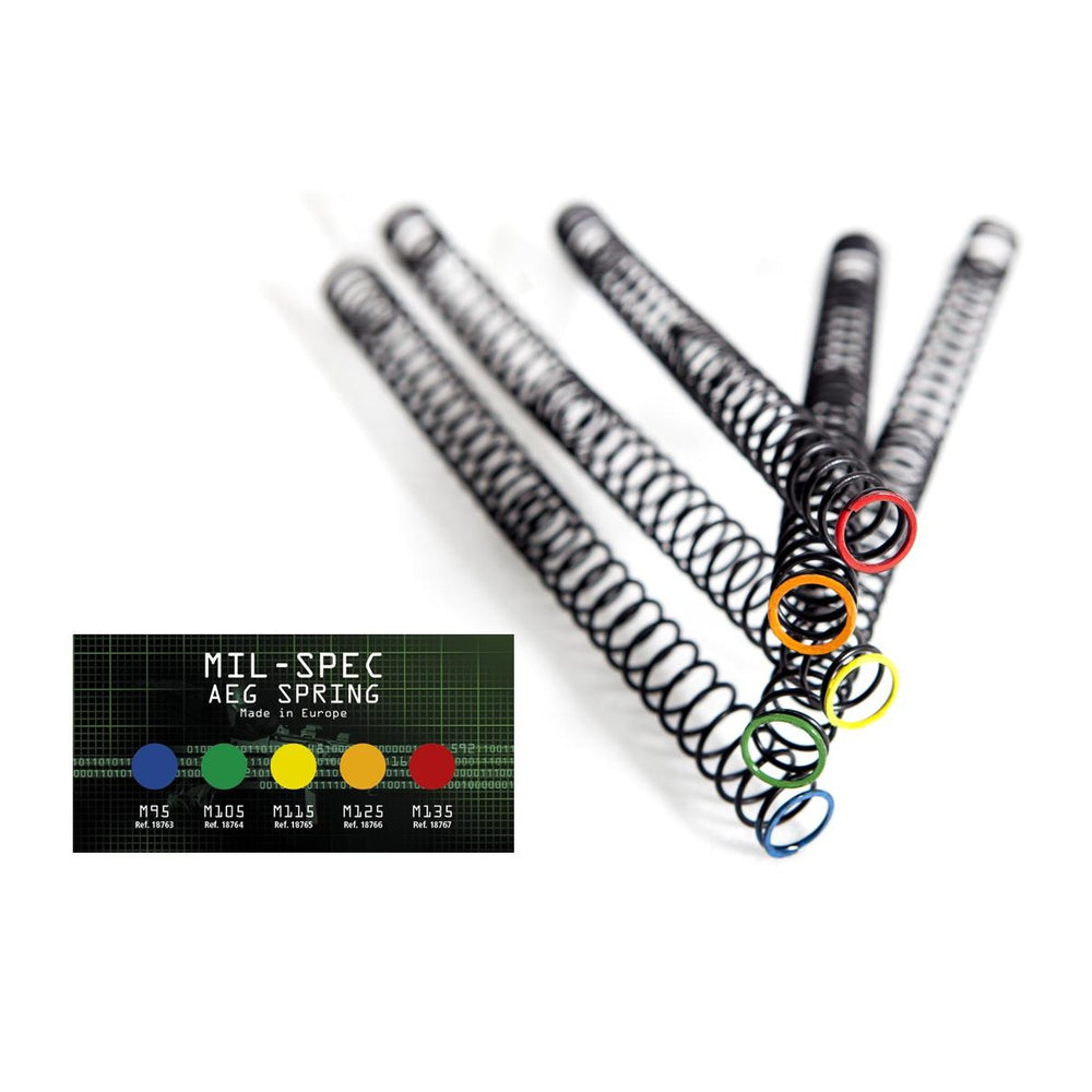 ActionSportGames Ultimate Upgrade Springs are manufactured from military grade steel for the best performance possible. Using SiCr grade steel allows Ultimate Springs to offer maximum power and consistency with every shot. Tightly coiled and ground spring ends and progressive coiling ensure that the Ultimate Spring remains correctly aligned and consistently compressed and released in your AEG regardless of the rate of fire – every time your AEG cycles. Each Ultimate Spring has been rigorously tested and pre-compressed, minimising power loss from initial compression found in competing brands. Each ASG Ultimate Spring has a convenient colour coded end so that you can see at a glance what power level you have selected. Available in M95 (blue) , M105 (green) , M115 (yellow), M125 (orange), and M135 (red)