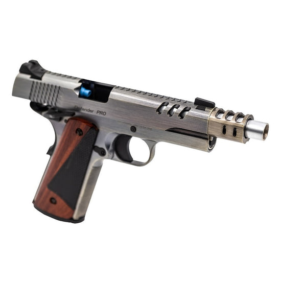 The DEFENDER PRO has an entirely new slide featuring 3 forward vent ports, a top slide ripple pattern and rippled slide grips. The design of the vent ports has been incorporated unto a new twist and click moderator that is very easy to remove. Included is a spare barrel bushing if it is the non-moderated look that is required. The pistol grips are a split wood/polymer construction, this leads to a striking design. Finally, a solid trigger is being used for the first time on a VORSK model.Customers will receive their GBB replicas in a magnetically sealed box with Velcro patch holders and a Manual sleeve, allowing the box to be used for display and storage at home should the customer wish.This MEU GBB Pistol is available in traditional monochrome colours Black, Chrome & Brushed Aluminium with a Dual Tone Blue option available. The flagship Chrome/ Black and Black/ Chrome design is available as a contrasting double pack, as well as the Dual Tone Blue option.Included(x1) CS Defender Pro MEU Brushed ALU(x1) STD Gas Magazine Black - VGM-03-02(x1) Barrel Bushing Tool(x1) *Dog Tags - Matching Serial #(x1) Spare Barrel Bushing(x1) Spare Gas Nozzle(x1) CO2 Conversion Kit (Nozzle + Spring)(x1) Manual(x1) Exploded Parts Diagram(x1) VORSK PVC Patch(x1) Magnetically Sealed Display Box