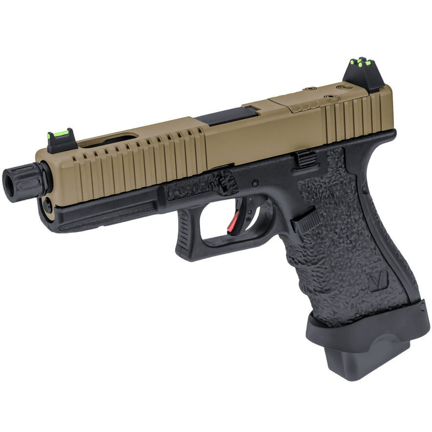 Length (mm)220Weight (g)510Fire ModesSemi AutoBarrel Length (mm)90Barrel Bore (mm)6.03Rails20mm Frame RailFeet Per Second290 - (VORSK V6, 0.20g BB at 20c)310 - (VORSK V8, 0.20g BB at 20c)Main MaterialsFrame - HIPS PolymerSlide - Aluminium AlloyInternal Mechanisms - Steel, Brass & Aluminium AlloyFeed Lips/ Nozzles - PolymerIncluded(x1) VORSK EU7-T Replica(x1) EU Series 23R STD GAS Magazine(x1) 12mm (CW) to 14mm (CCW) Thread Adaptor Flash Hider (Fitted)(x2) Grip Back Straps(x1) Spare Gas Nozzle(x1) Spare O-Ring Set(x1) Manual(x1) Parts Diagram(x1) PVC PatchCompatible MagazinesVGM-01-01 - EU Series 23R STD GAS MagazineVGM-01-03 - EU Series 23R STD CO2 MagazineVGM-01-02 - EU Series 48R EXT GAS MagazineCompatible Batteries / GasVCP-GAS-V6 - V6 GBB FuelVCP-GAS-V8 - V8 GBB FuelOther Info/SpecsCNC Finished SlideHydrostatic Paint FinishTM/WE CompatibleIn keeping with VORSKs desire to offer genuine alternatives to their customers they have taken the popular EU Series and spun a Tactical offering as well as an eye-catching Vented option.Fibreoptic Sights / BDS OptionReduced Weight Slide (VENTED)Flared MagwellExtended Magazine BaseplateFluted Outer BarrelSemi (EU17) or Fully Automatic (EU18)With both EU7 (Semi ONLY) and EU8 (Semi/ Fully Automatic) available, with or without DOT SIGHTs fitted, a TACTICAL or VENTED Slide and 8 colour finishes, there are plenty of EU Series models to choose from.All models are enhanced with design choices not found on standard EU series replicas. Raised fibreoptic iron sights improve target acquisition, VORSKs high-stipple polymer pistol grip ensures a firm grip on those wet & windy days, further improved by the flared magwell. The notch in the magwell flare along with extended magazine baseplates improve reload speeds and finally all models come fitted with a 12 mm CW to 14 mm CCW thread adapter hidden underneath a barrel flash hider/ cover.TACTICALThe TACTICAL option features a full-weight Aluminium Alloy Slide that features deep-groove ridge cuts on the forward & rear slide sections to help improve slide grip when racking your first BB. Colour choices are more reserved for the TACTICAL options, with all of the furniture & frame remaining black when choosing different slide colours (excluding GOLD & CHROME that have their furniture in the same colour as the slide).VENTEDThe VENTED slides distinctive forward vent ports give this EU platform its unique look. These windows look unto the fluted outer-barrel that is generally an alternative colour to the slide providing a truly different & eye-catching look. The vent ports also result in some slide weight-reduction which enhances the shooting experience as the recoil cycle is both faster & more snappy when compared to standard EU series GBB replicas. As mentioned above, the fluted outer barrel is often a chrome finish, along with the rest of the pistols frame mounted furniture that often results in a triple-coloured replica (eg. Tan, Black & Chrome) with some exceptions.