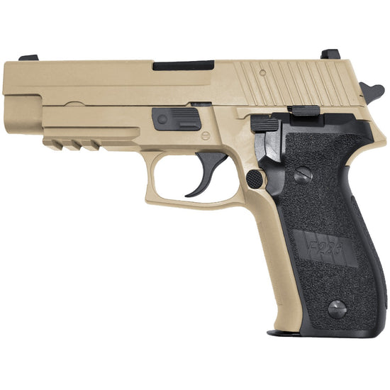DescriptionBased off of the real steel counterpart P226 9mm, this pistol is a P226 with front rail. WE Tech has created a full metal slide pistol with metal components where required. This model also features a de-cocking lever as well.Product Description:Name:F226Product Code:WE-F226Inner Barrel Length:257 mmStock Inner Barrel Length:96.8 mmInner Barrel Diameter:6.01 mmStock Inner Barrel Diameter:6.08 mmBarrel Length:113 mmBarrel Threading:14mm +/clockwiseMain Material(s):Full MetalColour:Black and TanCaliber:6 mmMagazine Type:Green gasMagazine Capacity:22 roundsMethod of Operation:Gas BlowbackFire mode(s):Safe, SemiHop-upYes Adjustable