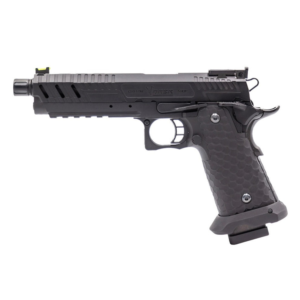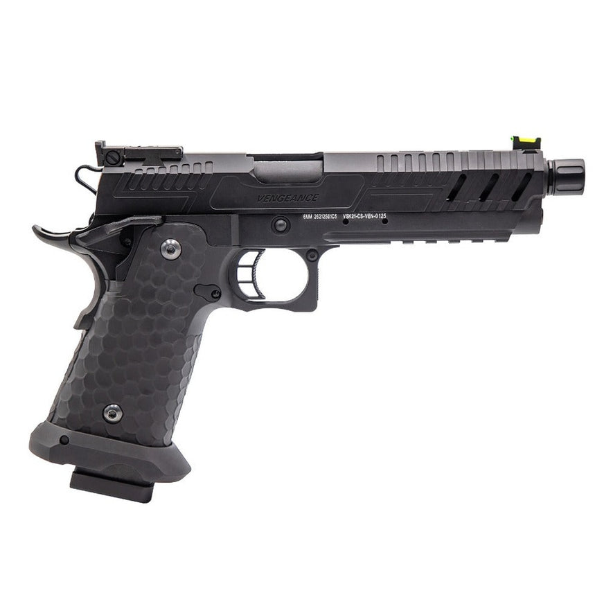 The CS VENGEANCE is VORSKs first Hi-Capa variant to come through their Custom Shop range, and what a Hi-Capa it is. Based on a popular race-platform sidearm, VORSK have furthered this design by introducing a floating BDS option to the world of Airsoft Replicas. Add to this a distinct range of colours including a Metallic Red, and a Dark Earth/ Tan variant, the CS VENGEANCE is another desirable sidearm from VORSK.When compared to VORKSs standard 5.1 Hi-Capas, the CS VENGEANCE features a new adjustable rear iron-sight, an extended magazine base plate and the inclusion of a floating BDS option. The slide markings are a new pattern with some forward cut-outs revealing the fluted outer barrel within. A common feature of our Hi-Capas is the inclusion of a Flash-Hider, that expertly covers a 12 mm (CW) to 14 mm (CCW) thread adaptor, making VORSK Hi-Capas attachment ready, especially with the real-estate provided by the Picatinnyunder barrel.Customers will receive their VORSK VENGEANCE in a magnetically sealed box with Velcro patch holders and a Manual sleeve, allowing the box to be usedIncluded(x1) CS VENGEANCE(x1) STD Gas VENGEANCE Magazine Black - VGM-02-03(x1) 12 mm to 14 mm Thread Adaptor FLASH HIDER(x1) Barrel Bushing Tool(x1) *Dog Tags - Matching Serial #(x1) Spare Gas Nozzle(x1) CO2 Conversion Kit (Nozzle + Spring)(x1) Manual(x1) Exploded Parts Diagram(x1) VORSK PVC Patch(x1) Magnetically Sealed Display Box