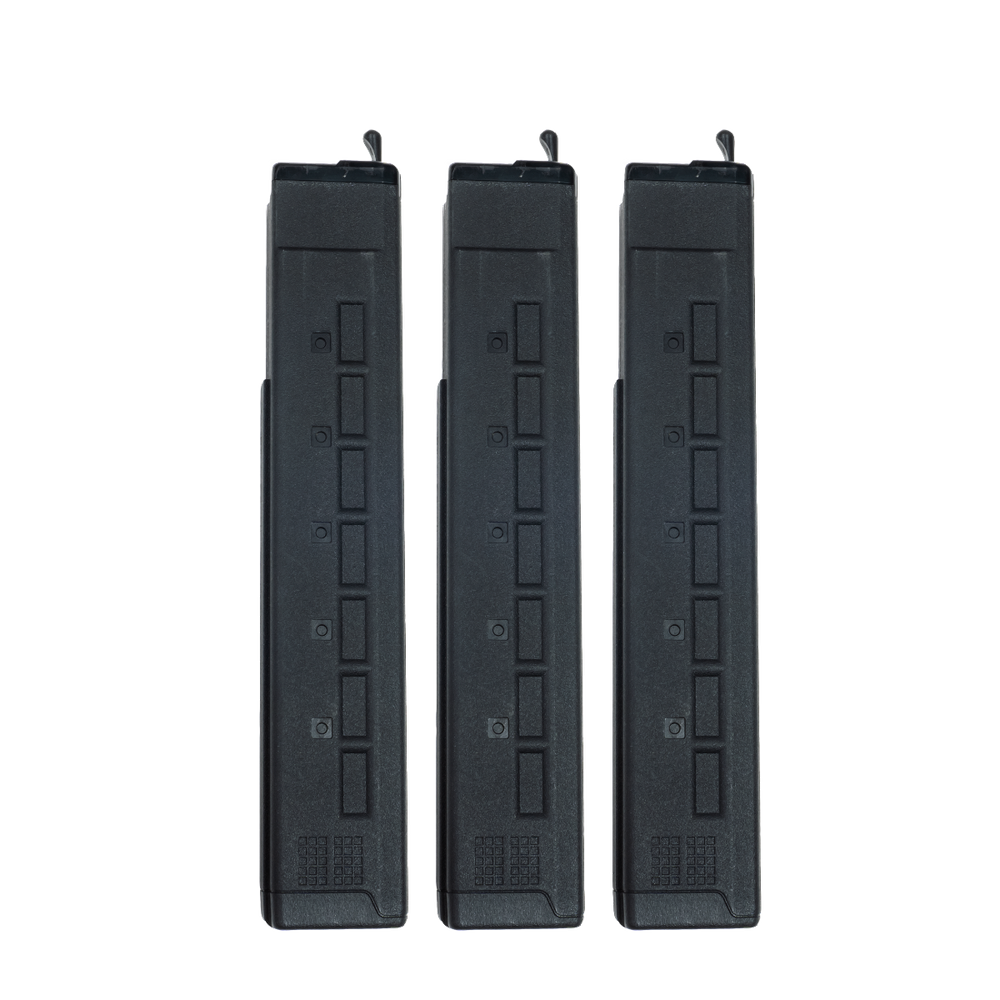 Stay locked and loaded with this 3-pack of 80 round mid-cap magazines for the new QRF MOD.3 AEGs! These durable but lightweight nylon polymer magazines have a side grip panel with KWA’s custom stippling texture, as well as extra grip lines on the front to help with weapon manipulation.