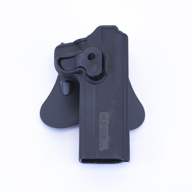 NUPROL holster series are made of durable law enforcement grade black polymer and specifically designed for use with WE Pistols that do not fit standard holsters.NUPROL Perfect Fit holsters are a rotating belt holster that fits WE, TM, and many others. NUPROL also offer a Drop Leg Panel and MOLLE Adaptor for a choice of platforms