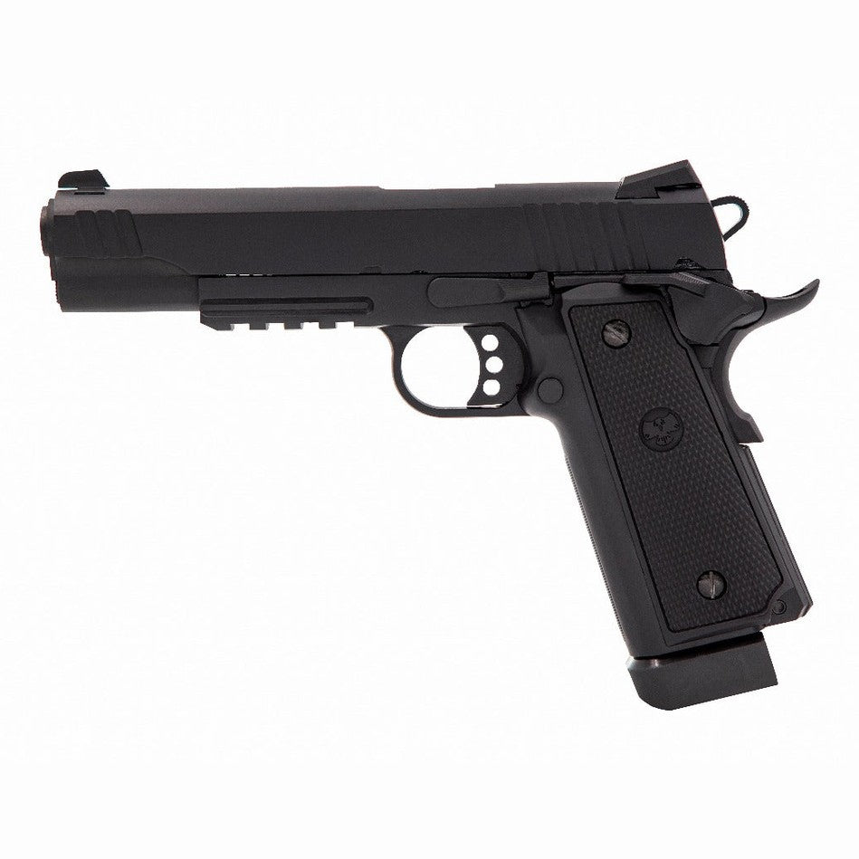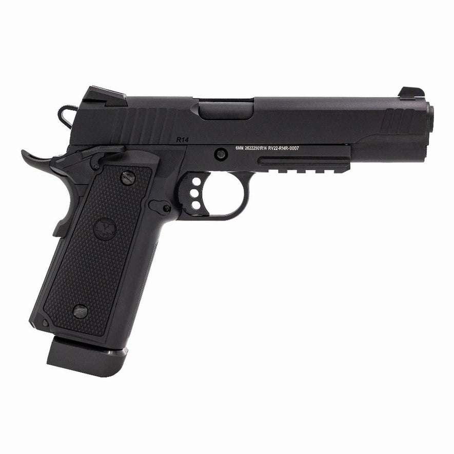 What makes a great Airsoft Combat Pistol? One with excellent holstering options? Railed for Torches/Laser Units? Has Doubled Stacked Magazines with a Large Gas Reservoir? Features a Metal Slide with excellent Gas-Blow-Back Action? RAVEN think all of these things matter, which is why theyre very excited to release their latest GBB Airsoft Pistol the R14.The RAVEN R14 brings together concepts found within RAVENs current range of Airsoft Pistols to produce a punchy yet efficient sidearm. Starting with the true powerhouse of a GBB pistol, the 23 round magazine is double-stacked which allows for a lot of gas storage ensuring youll unload the magazine to empty so long as the correct gas is used for the environmental conditions. Surrounding the magazine is the moulded-stipple RAVEN Grip, as well as the Beaver Tail safety fitted to the rear (a secure grip must be provided before the trigger is allowed to move to fire). The frame features a Picatinny Accessory Rail essential for going full-tactical with lights & laser units. Bringing this replica together is the R14s slide very reminiscent of 1911 slides but as it is sitting atop a frame that includes a double-stacked magazine, the R14 has a top-tier power-to-weight ratio giving the user a memorable recoil experience. As this slide is profiled to the common 1911 slide, youll find plenty of holster options available on the market.Available in a selection of colours.