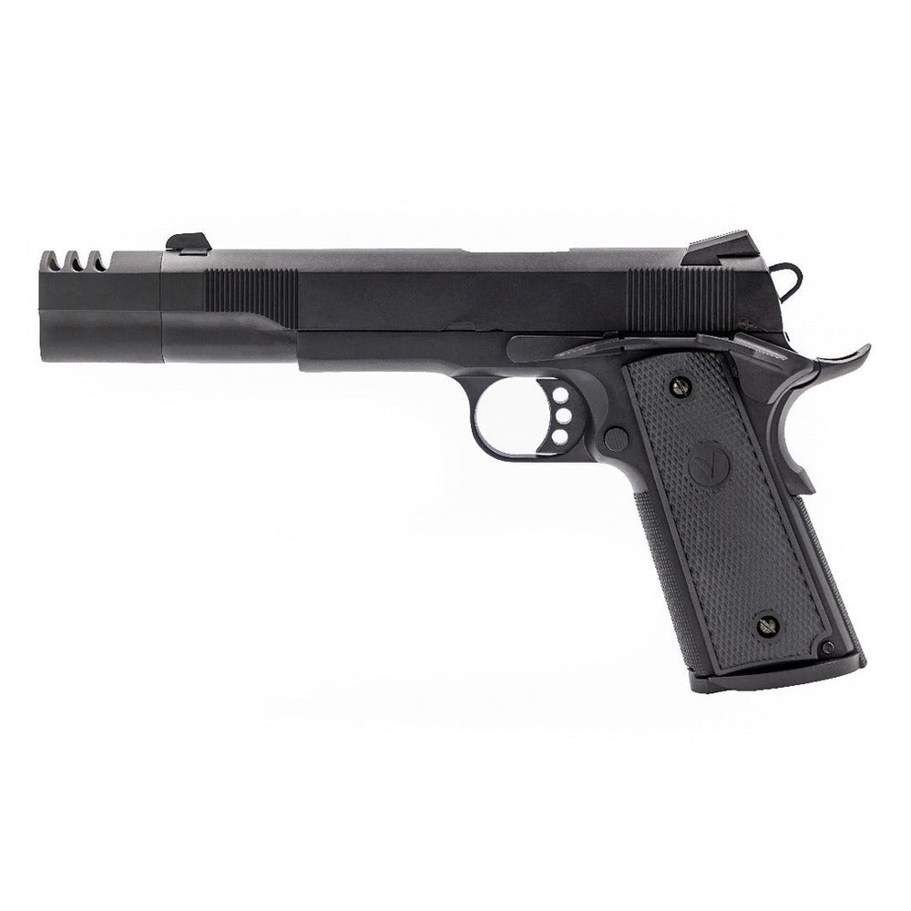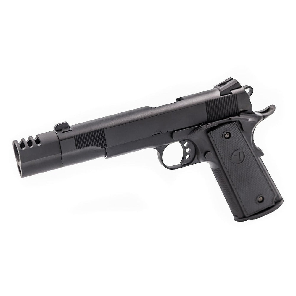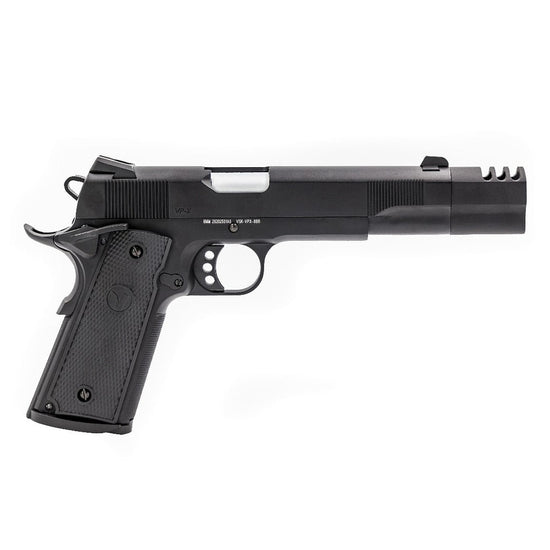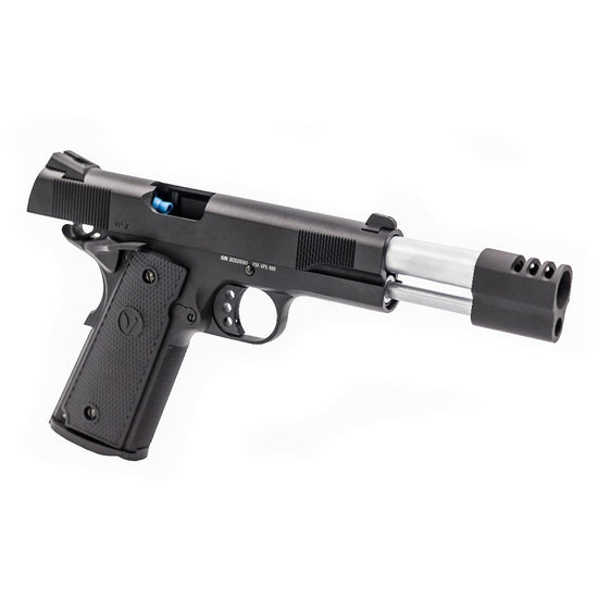 Removable VORSK CompensatorV-Notch Iron Sights/ Raised Fibre Optic Iron Sights + BDSHigh Stipple, Polymer Hand GripBespoke MEU Slide incorporating Vertical Slide GripsFunctioning Beaver Tail Grip SafetySlide Lock LatchChrome Inner BarrelAvailable as a Double PackAvailable with/ without BDS fittedAvailable in Black-Chrome / Black / Chrome / Brushed Aluminium / Grey / Tan / Dual Tone BlueIntroducing the latest product from VORSK the VP-X.The VORSK VP-X is a 1911/MEU hybrid Gas-Blow-Back pistol replica that features a bespoke VORSK compensator, VORSK pistol grips and a refined dual-tone colour scheme.All of VORSK pistol designs are passion projects, and the VP-X is no different. Influenced from designs of modern 1911/MEU variants that are found both on the firing range and in pop culture, VORSK have bought another GBB replica to life with the VP-X. A full metal construction finished with a anti-porous, electrostatic finish, the customer has a choice of 8 colour variants including a dual-tone Blue. Dual Tone can be considered a theme of this GBB Pistol, with a choice body colour complimented by a secondary colour found on the moderator, trigger, mag-release, hammer, slide-lock and other furniture. These small touches of a secondary colour, scattered across the pistol, result in a very stylish 1911/MEU variant. On top of this, alongside the flagship Black/Chrome double pack, VORSK have also provided a Dual-Tone double pack so everyone can go akimbo with some VORSK VP-X pistols.The slide features two 90 vertical slide grips, a fixed VORSK compensator and V-notch iron sights (standard models) or a VORSK BDS with a bespoke sight mounting plate. All models have a Chrome outer barrel and spring guide, drawing the eye to the barrel extending fixed moderator. New, high stipple VORSK 1911/MEU pistol grips finish off the refined look of this pistol.