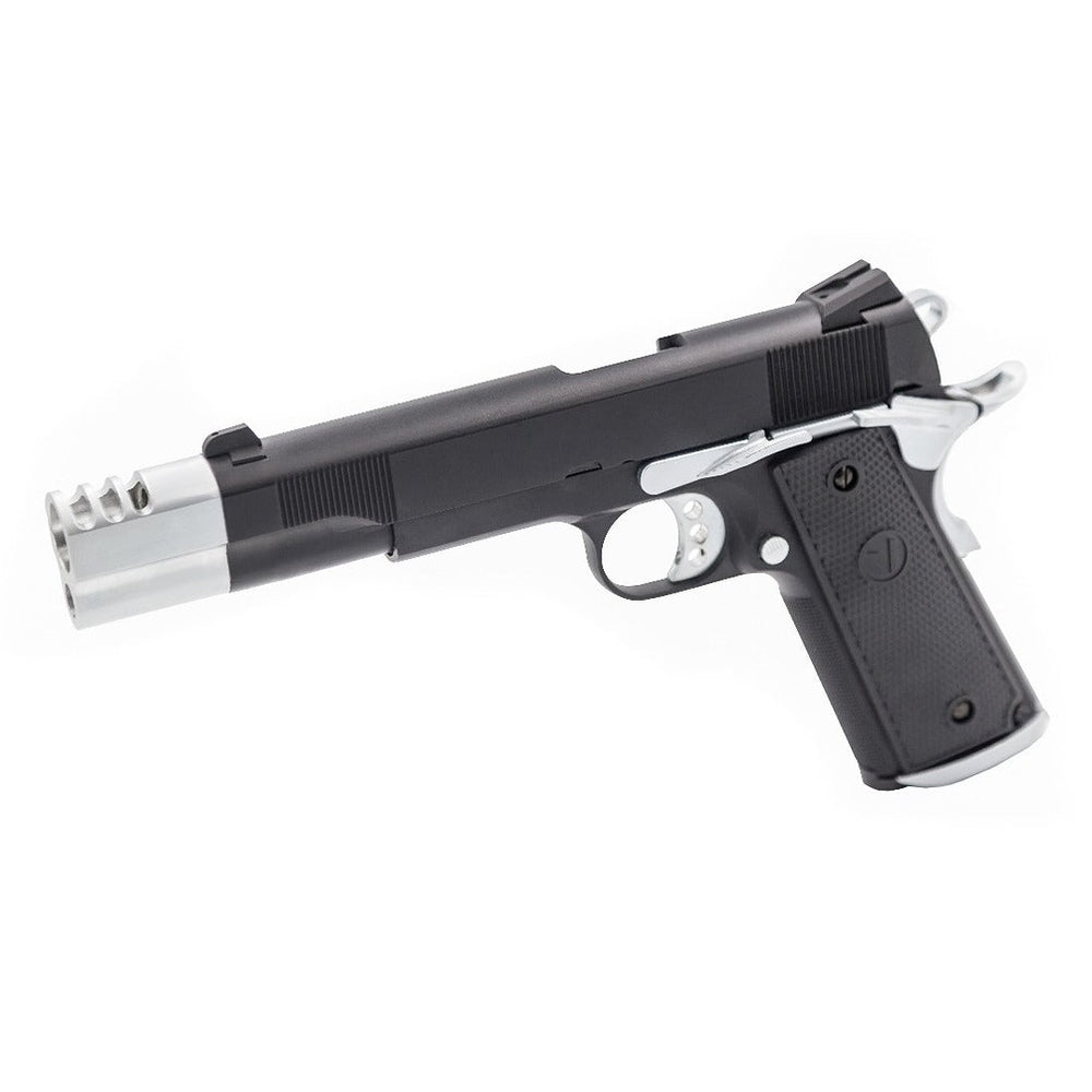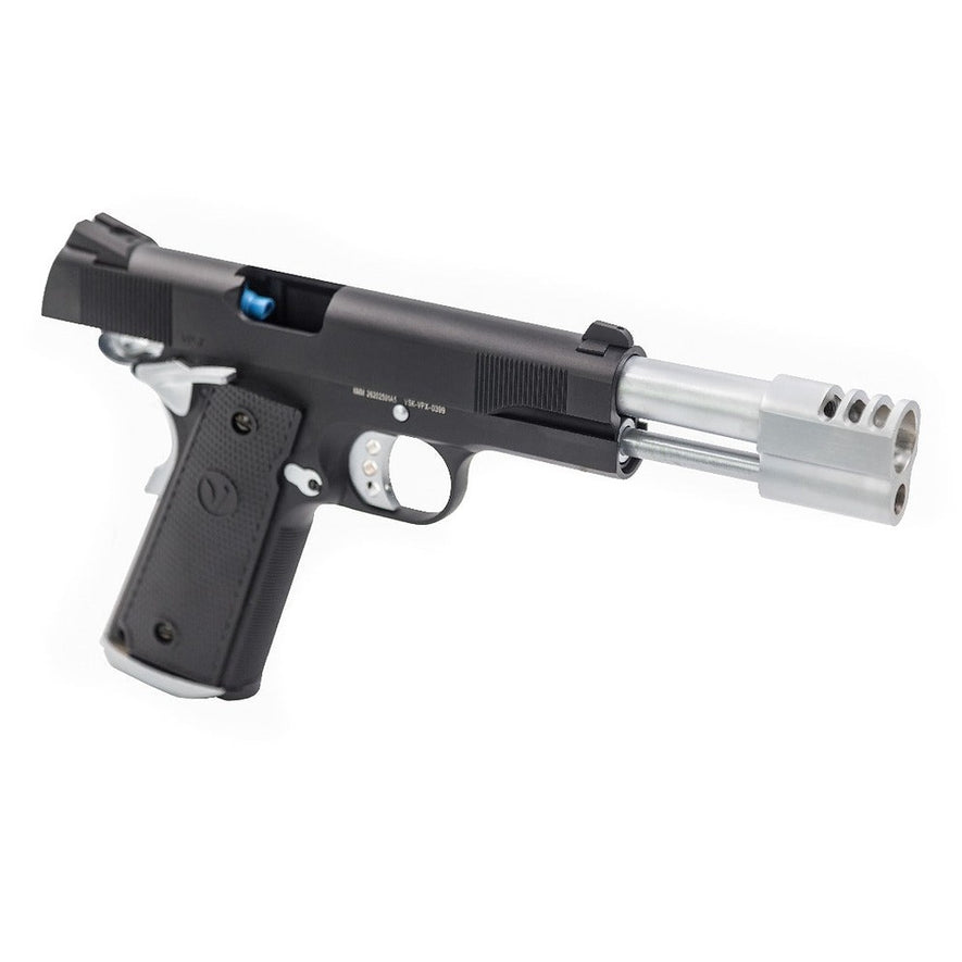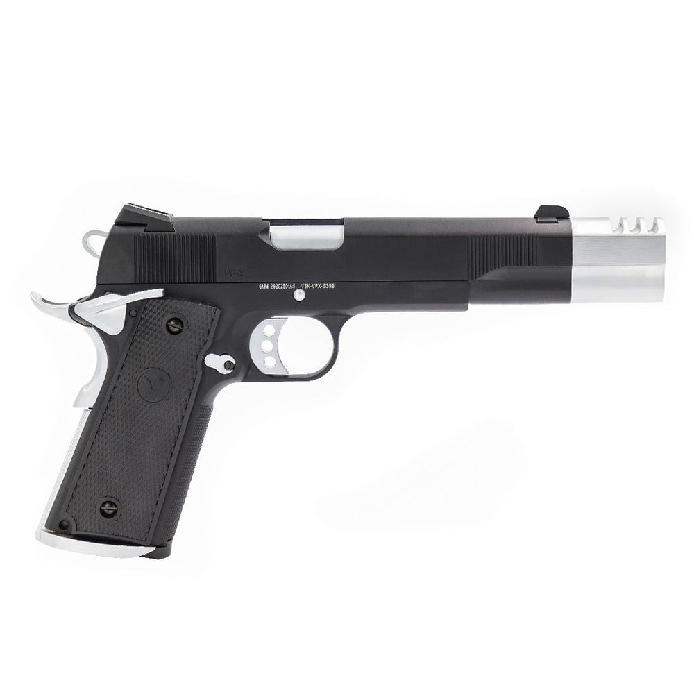 Removable VORSK CompensatorV-Notch Iron Sights/ Raised Fibre Optic Iron Sights + BDSHigh Stipple, Polymer Hand GripBespoke MEU Slide incorporating Vertical Slide GripsFunctioning Beaver Tail Grip SafetySlide Lock LatchChrome Inner BarrelAvailable as a Double PackAvailable with/ without BDS fittedAvailable in Black-Chrome / Black / Chrome / Brushed Aluminium / Grey / Tan / Dual Tone BlueIntroducing the latest product from VORSK the VP-X.The VORSK VP-X is a 1911/MEU hybrid Gas-Blow-Back pistol replica that features a bespoke VORSK compensator, VORSK pistol grips and a refined dual-tone colour scheme.All of VORSK pistol designs are passion projects, and the VP-X is no different. Influenced from designs of modern 1911/MEU variants that are found both on the firing range and in pop culture, VORSK have bought another GBB replica to life with the VP-X. A full metal construction finished with a anti-porous, electrostatic finish, the customer has a choice of 8 colour variants including a dual-tone Blue. Dual Tone can be considered a theme of this GBB Pistol, with a choice body colour complimented by a secondary colour found on the moderator, trigger, mag-release, hammer, slide-lock and other furniture. These small touches of a secondary colour, scattered across the pistol, result in a very stylish 1911/MEU variant. On top of this, alongside the flagship Black/Chrome double pack, VORSK have also provided a Dual-Tone double pack so everyone can go akimbo with some VORSK VP-X pistols.The slide features two 90 vertical slide grips, a fixed VORSK compensator and V-notch iron sights (standard models) or a VORSK BDS with a bespoke sight mounting plate. All models have a Chrome outer barrel and spring guide, drawing the eye to the barrel extending fixed moderator. New, high stipple VORSK 1911/MEU pistol grips finish off the refined look of this pistol.