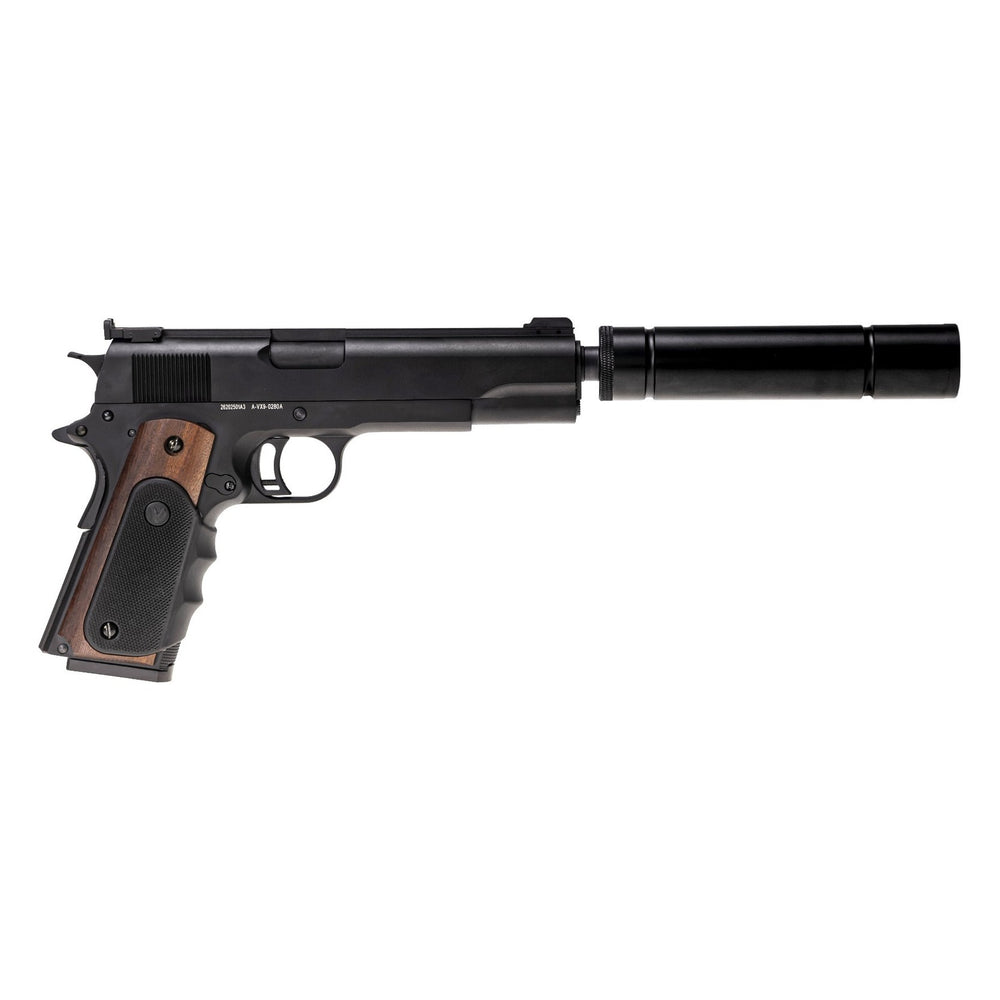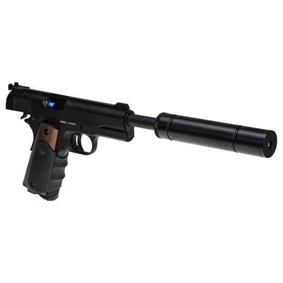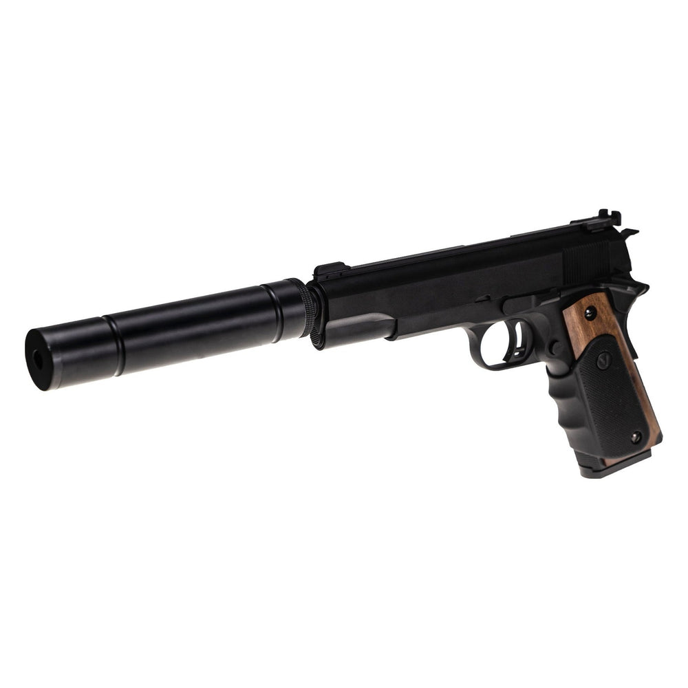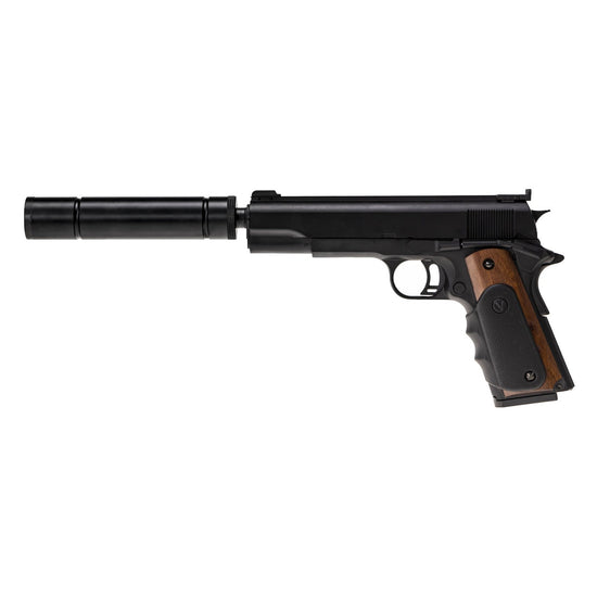 The VX9 features a clean slide with an integrated signature ridge that runs the full length of the top of the slide and integrates the front and rear sights in this distinctive manner. The ridge is integrated into the mould and is one piece and not attached to the slide. We also have custom wood and rubber grips with inlayed rubber texturized sections that wrap around the lower frame/grip.The VX9 also features threaded inner and outer barrels for barrel extension and the included Agency Silencer. Available in silver or black, and as a single model, the VX9 is also available as a matched pair in a special box featuring the two pistols, two magazines, and two extended magazines.The Vorsk Agency VX Series and all other models from Vorsk are inspired by the finest and most advanced modern combat and competition handgun designs, VORSK translates these unique and innovative concepts to the Airsoft market in the form of a totally new range of GBB pistols.VORSKs objective from initial concept to the market has been to provide robust, dependable GBB Pistols whilst also adding a touch of style & flair to your sidearm.In order to achieve this, VORSK have taken time and care to discuss and develop these concepts with leading Airsoft players and established, successful Airsoft manufacturers. These concepts then moved into extensive development, with new moulds and production techniques ensuring a first class product range.The results are a range of GBB pistols that are as effective on the field as they eye-catching on display.
