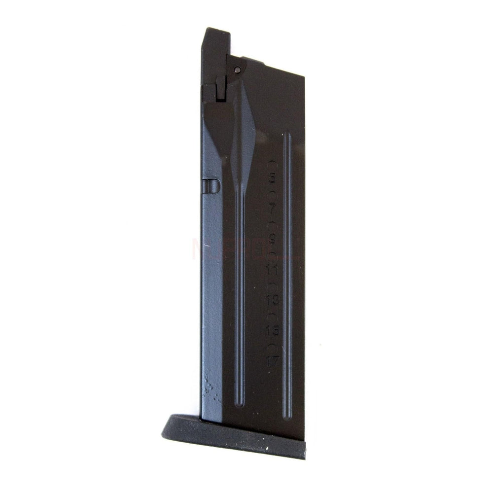 The magazine is constructed from Alloy, and is finished matte Black. The magazine itself features a removable bottom base for maintenance and is bottom filled with standard green gas bottles. The magazine holds up to 22 rounds, and is double stacked. These magazines are the perfect spare or replacement for those who already have a little or big bird, and want more mags, allowing for longer game play without having to stop to refill.