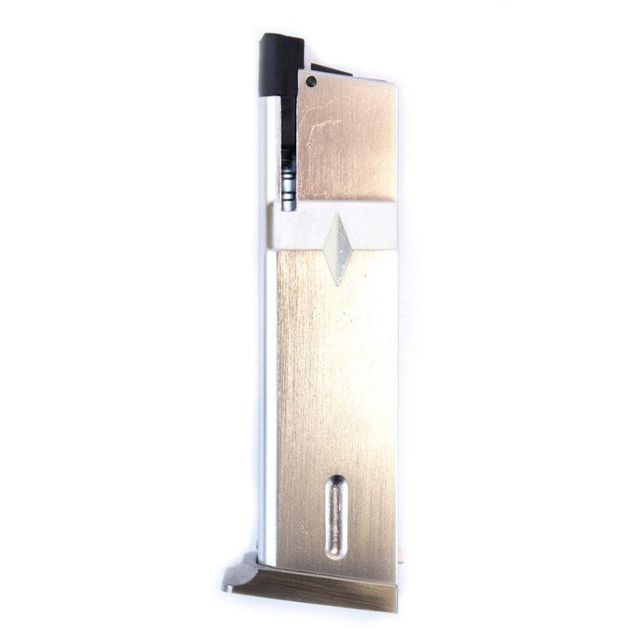 WE Makarov 645k 16rnd Magazine - Silver is a spare magazine for WEMakarov 645k Pistols. The magazine is constructed entirely from Alloy and features an Alloy Base Plate, making the magazine durable and more resistant to drops. The magazine is double stacked, and holds up to 16 rounds. The magazine is a perfect spare or replacement for the standard magazine for the pistol, and is great for those Airsoft players who want to spend more time in-game before having to stop and reload all their magazines. This is a must have purchase for any Airsoft player who runs a Pistol Only CQB loadout, allowing you to fire for longer, and carry more rounds.For Makarov 645KFull Alloy DesignAlloy Base Plate
